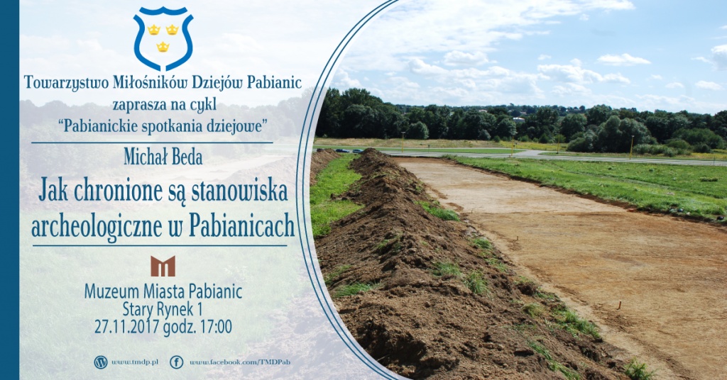 Już w pierwszych miesiącach działalności postanowiliśmy zorganizować spotkanie cyklu Pabianickie Spotkania Dziejowe.. Temat dotyczył ochrony stanowisk archeologicznych na terenie miasta i gminy Pabianice. Autorem był jeden z członków Towarzystwa magister archeologii Michał Beda.